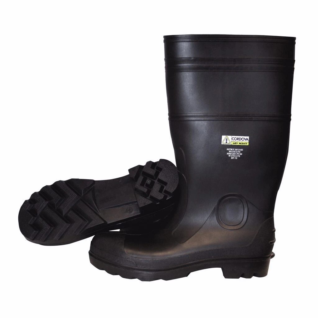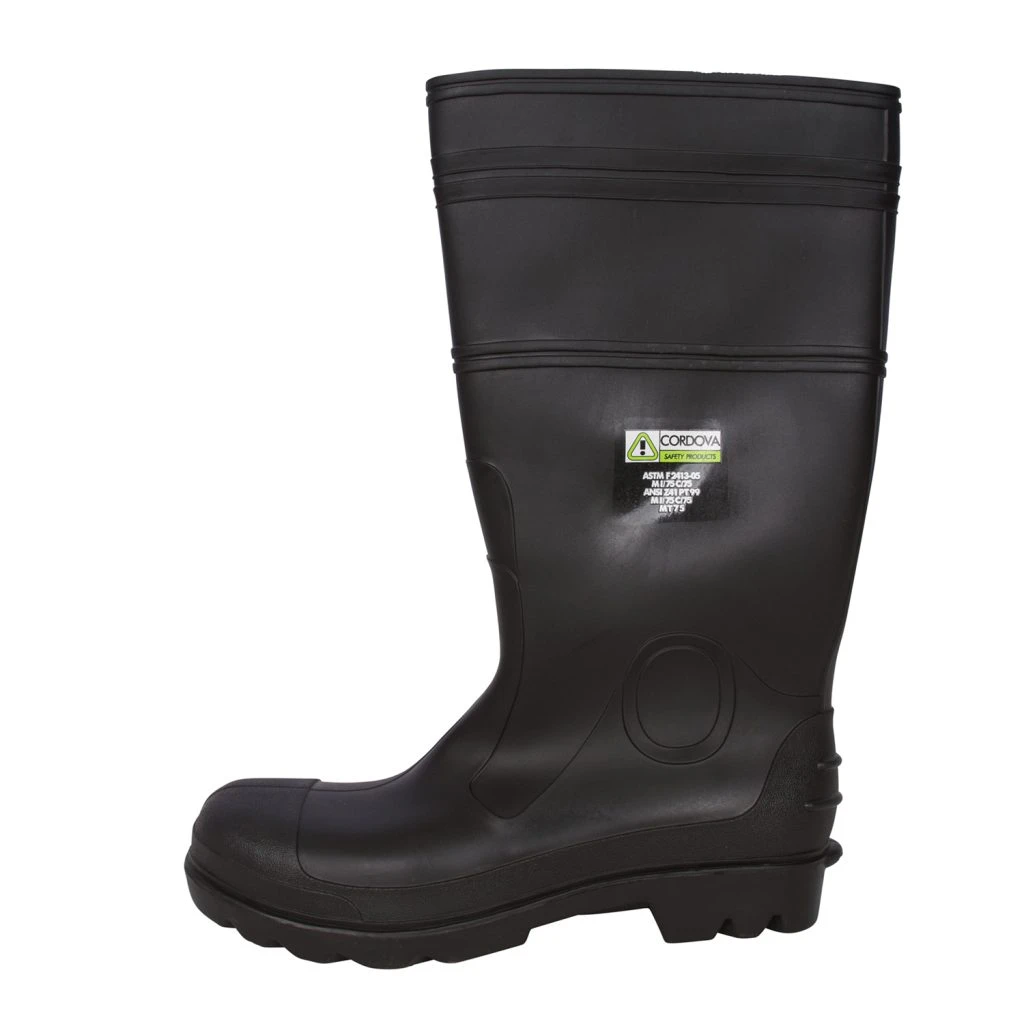 PVC Boots resist solvents, animal fats, light acids, alcohols and oil-based chemicals. They feature cut-off bands for height adjustment, punch-out holes for easy hanging, and kick-off spurs for quick removal. In addition, these black Cordova Safety Products-brand PVC boots provide steel toe and midsole, are polyester/cotton lined for comfort and are equipped with EVA (ethylene vinyl acetate) insoles for excellent shock absorption.