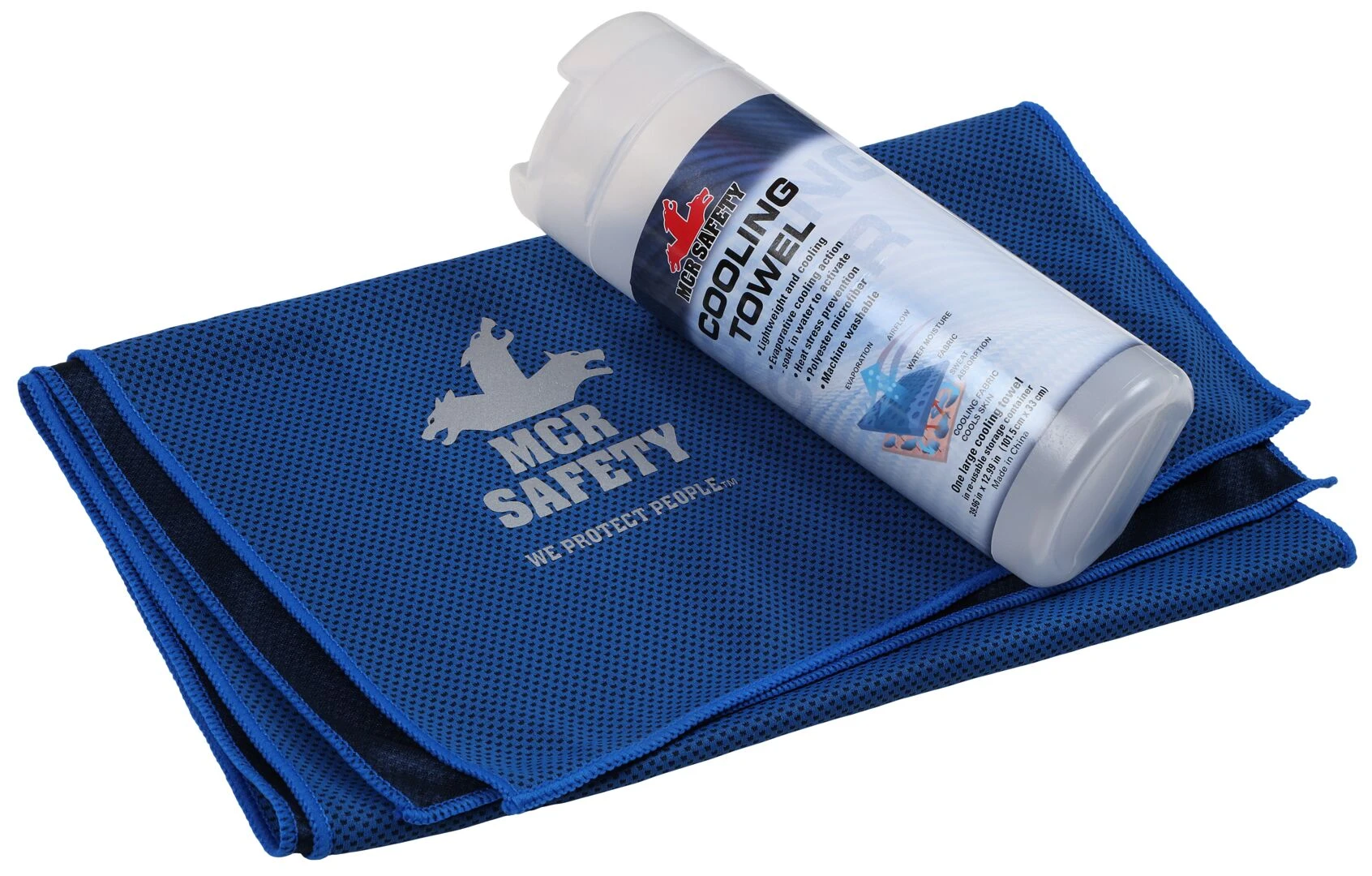 MCR Safety Cooling Gear – 1 Piece Large Blue Cooling Towel – Lightweight Polyester Microfiber – Machine Washable – Reusable Container to Safely Store After Use