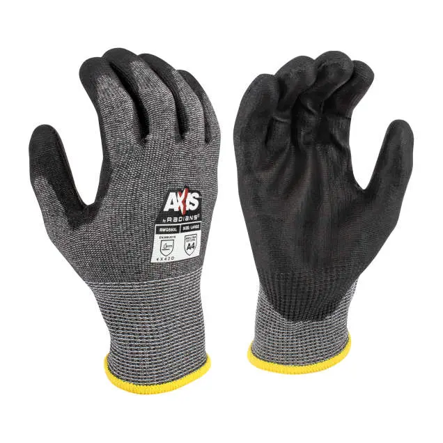 The RWG560, an Axis™ Series glove by Radians, has an ANSI Cut rating of A4. The RWG560 glove features a13 gauge, gray HPPE outer shell with fiberglass to provide significant protection against abrasion and cuts. The black PU palm coating provides excellent gripping power.