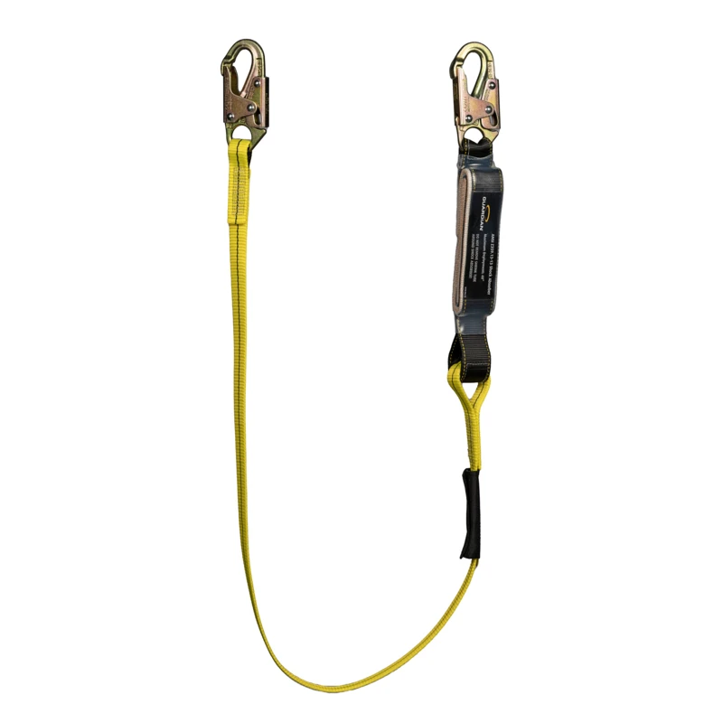 The External Shock Lanyard has an integral shock absorber pack sewn at one hook end and is available in different configurations to suit a variety of needs. No matter how simple your fall protection system, the connection device is an essential component. Always be sure to connect the shock absorber end to the dorsal D-ring on the full-body harness.