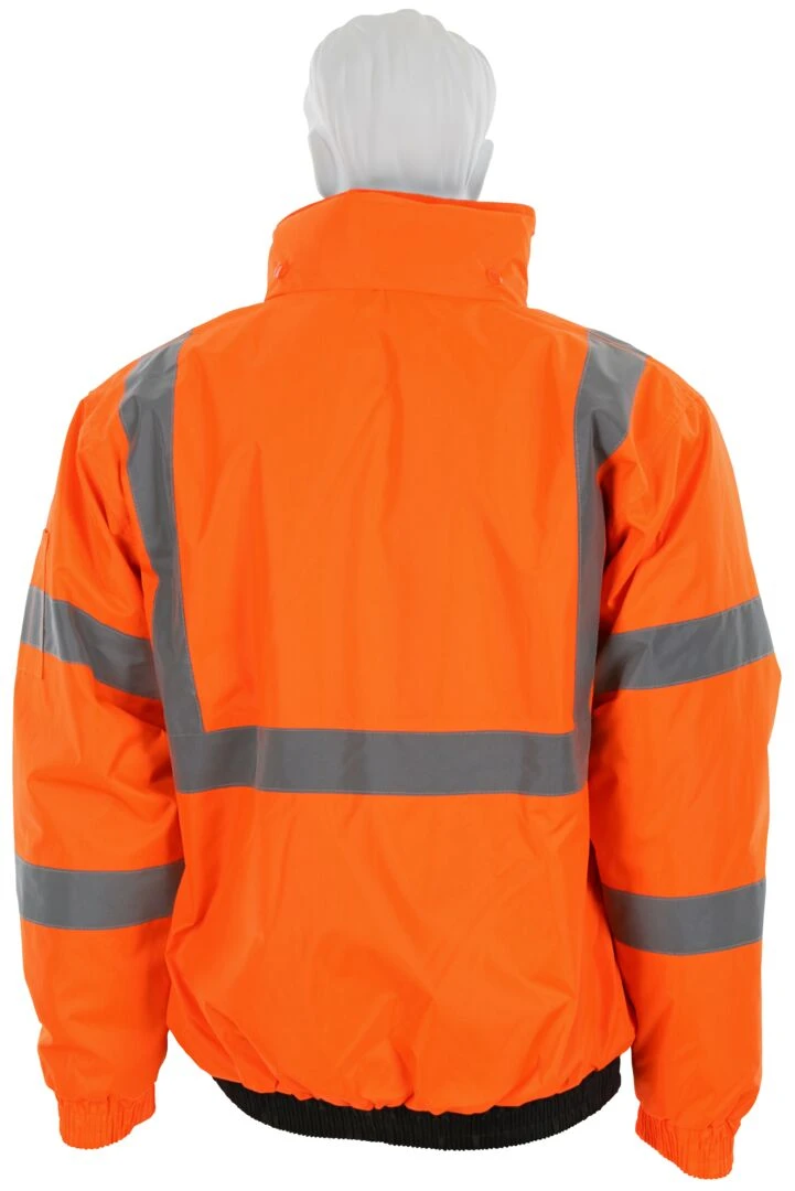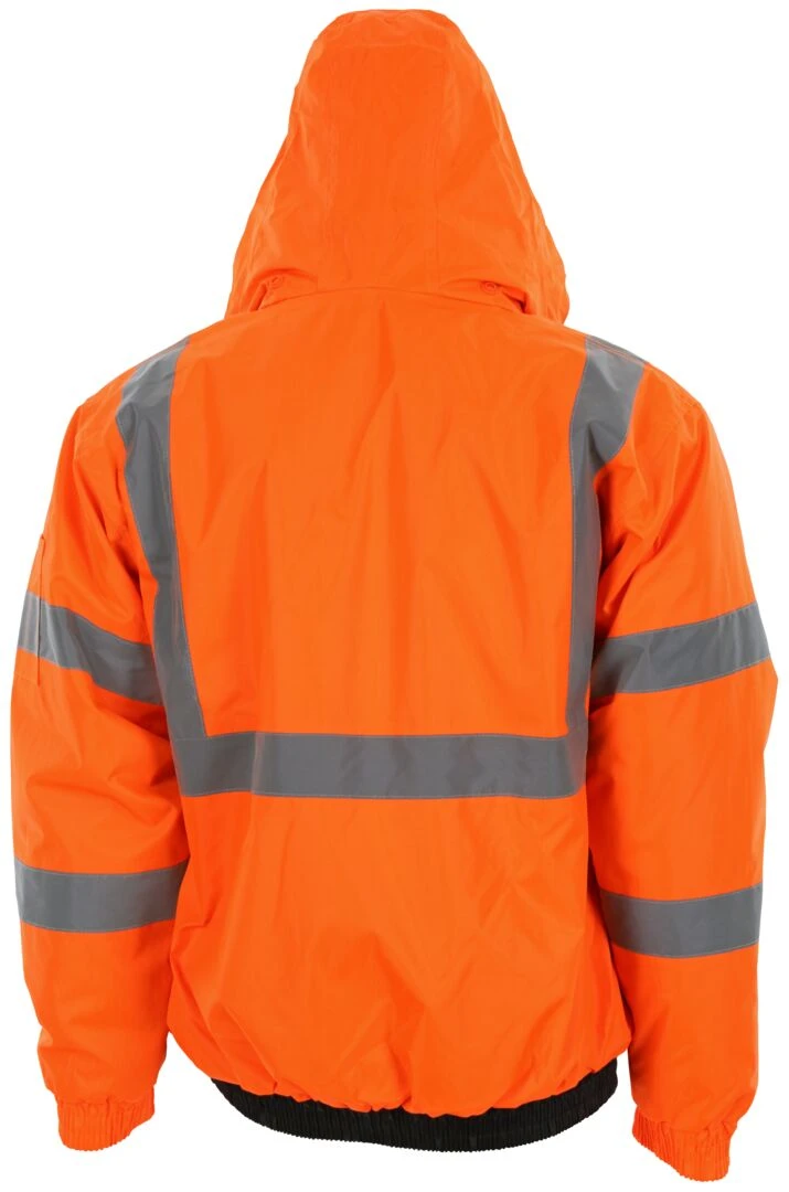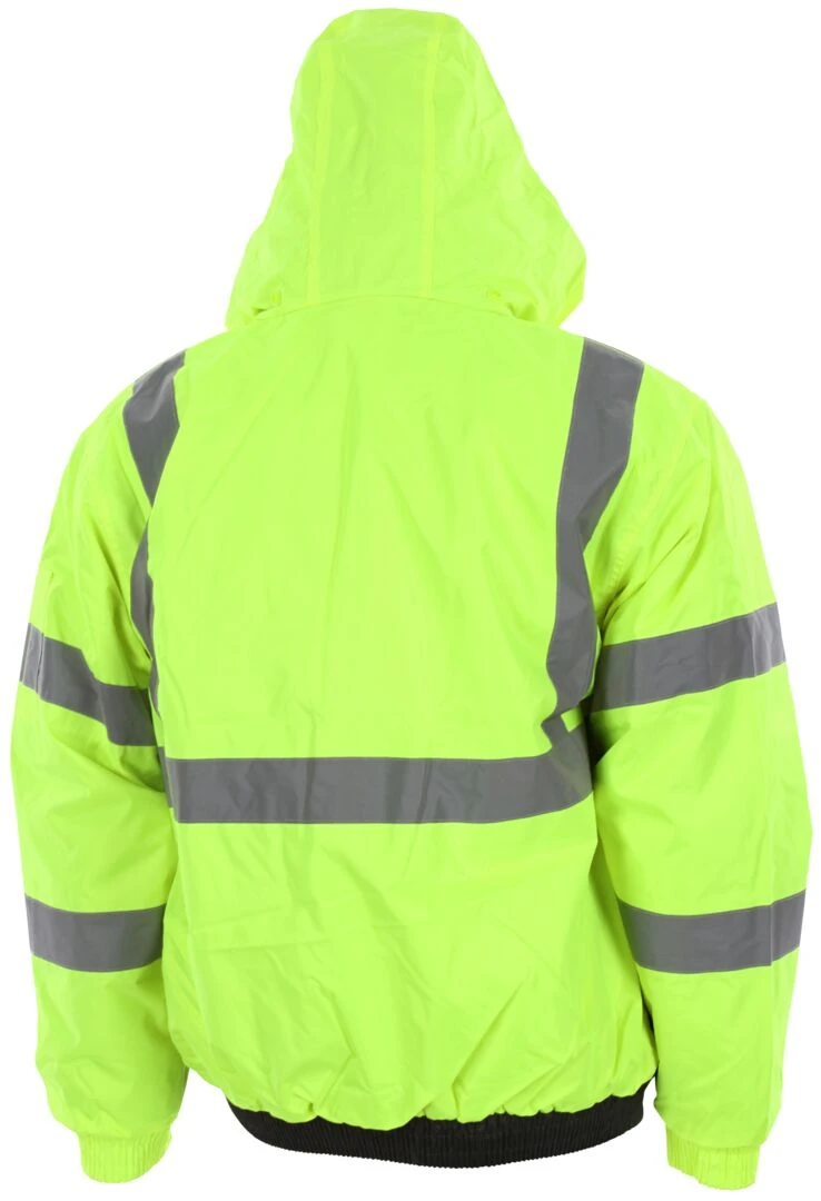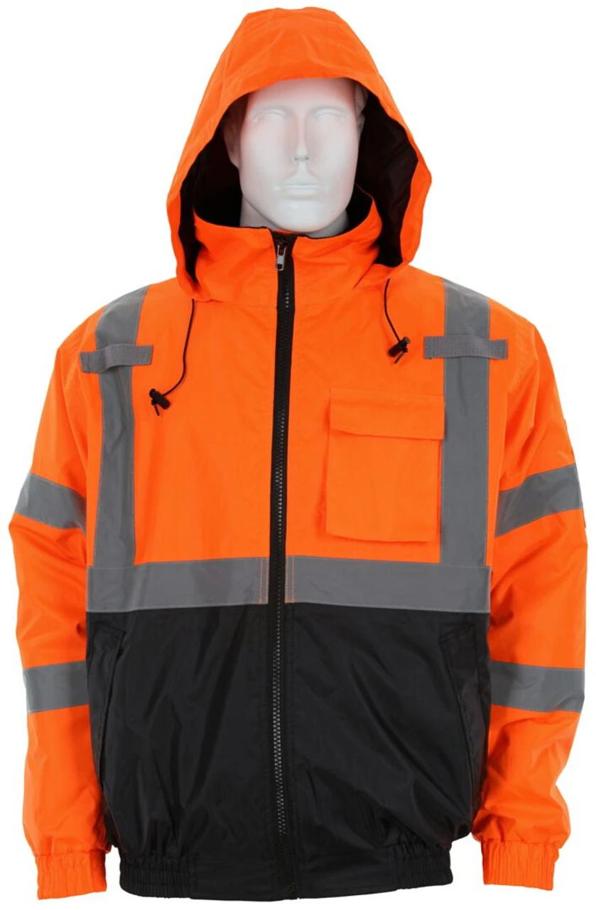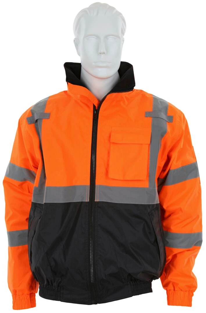 Luminator Series offers you a variety of high visibility garments to fit your specific applications. The VBBQCL3 is an ANSI/ISEA 107 2020 Type R, Class 3 compliant bomber jacket that features a bright fluorescent background color for daytime high visibility and 2-inch silver reflective stripes for low light visibility. The black shading on the lower front of the torso is dirt masking and extends wear life. The inner quilted liner adds warmth and comfort that you will enjoy wearing. Other features include a hideaway drawstring hood with pull stops, zipper front closure, two front pockets, left chest cell phone pocket, and left and right side mic-tab holders. Three inner pockets offer additional storage for belongings.