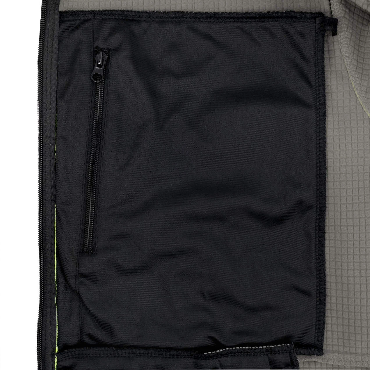 - 1 exterior zipper chest pocket, 2 lower exterior hand warmer pockets, 1 exterior sleeve pen pocket.